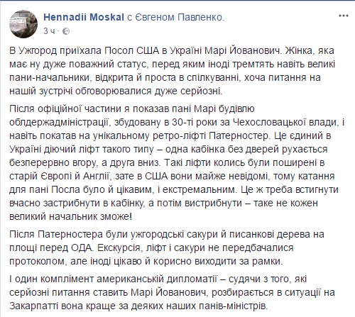 "В Ужгород приехала Посол США в Украине Мари Йованович. Женщина, которая имеет ну очень почтенный статус, перед которым иногда дрожат даже великие мира сего, открыта и проста в общении, хотя вопросы на нашей встрече обсуждались очень серьезные. После официальной части я показал госпоже Мари здание облгосадминистрации, построенное в 30-е годы при чехословацкой власти, и даже покатал на уникальном ретро-лифте Патерностер. Это единственный в Украине действующий лифт такого типа - одна кабинка без дверей двигается непрерывно вверх, а вторая вниз. Такие лифты когда-то были распространены в старой Европе и Англии, зато в США они почти неизвестны, поэтому катание для госпожи посла было и интересным, и экстремальным", - написал он.