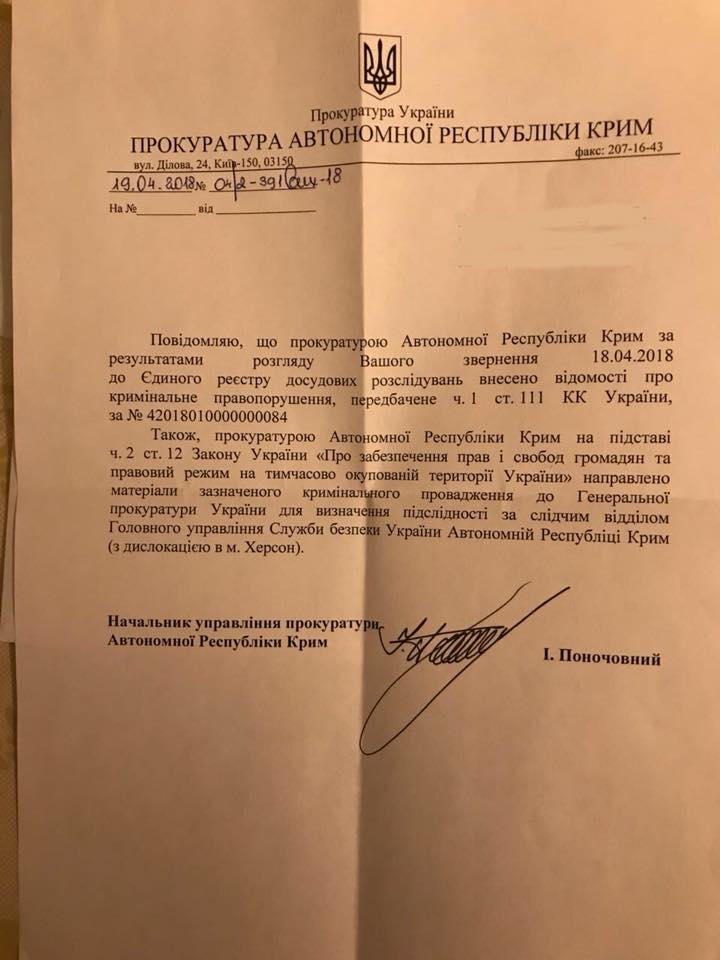 В результате, как следует из писем ведомств, размещенных Портновым, СБУ приобщила его информацию  к уже существующему делу, а прокуратура АР Крым внесла новое уголовное производство, которое касается Картошкина, в единый реестр досудебных расследований.