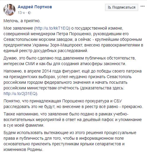 Согласно заявлению Портнова от 10 апреля, в 2014 году Константин Картошкин как гендиректор ПАО "Севастопольский морской завод", конечным владельцем которого был Петр Порошенко, оперативно ответил на письмо Минпроторга РФ о фактическом переходе предприятий под юрисдикцию России. По мнению Портнова, Картошкин своим ответом о финансово-хозяйственной деятельности возглавляемого предприятия признал потерю украинской властью Крыма и правомерность деятельности органов иностранного государства.
