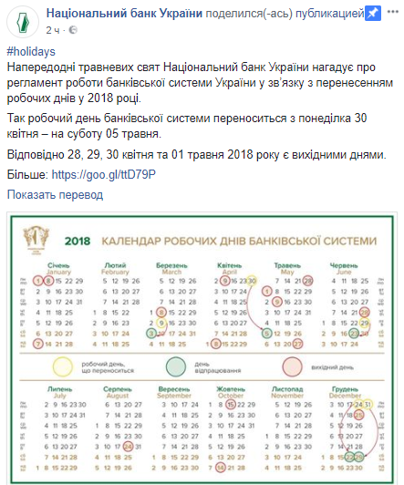 Нацбанк Украины напомнил о регламенте работы системы электронных платежей и банковской системы Украины в период майских праздников. График опубликован на странице ведомства в Facebook.
