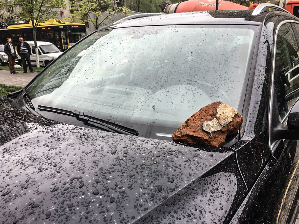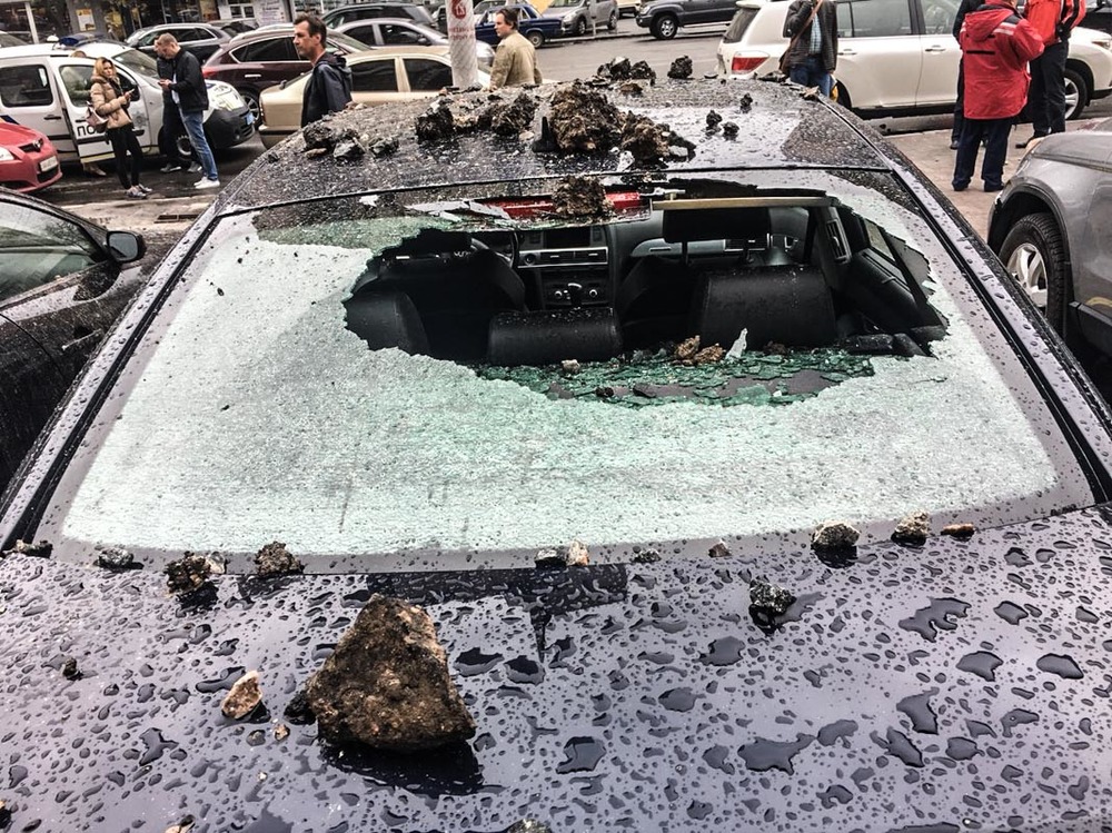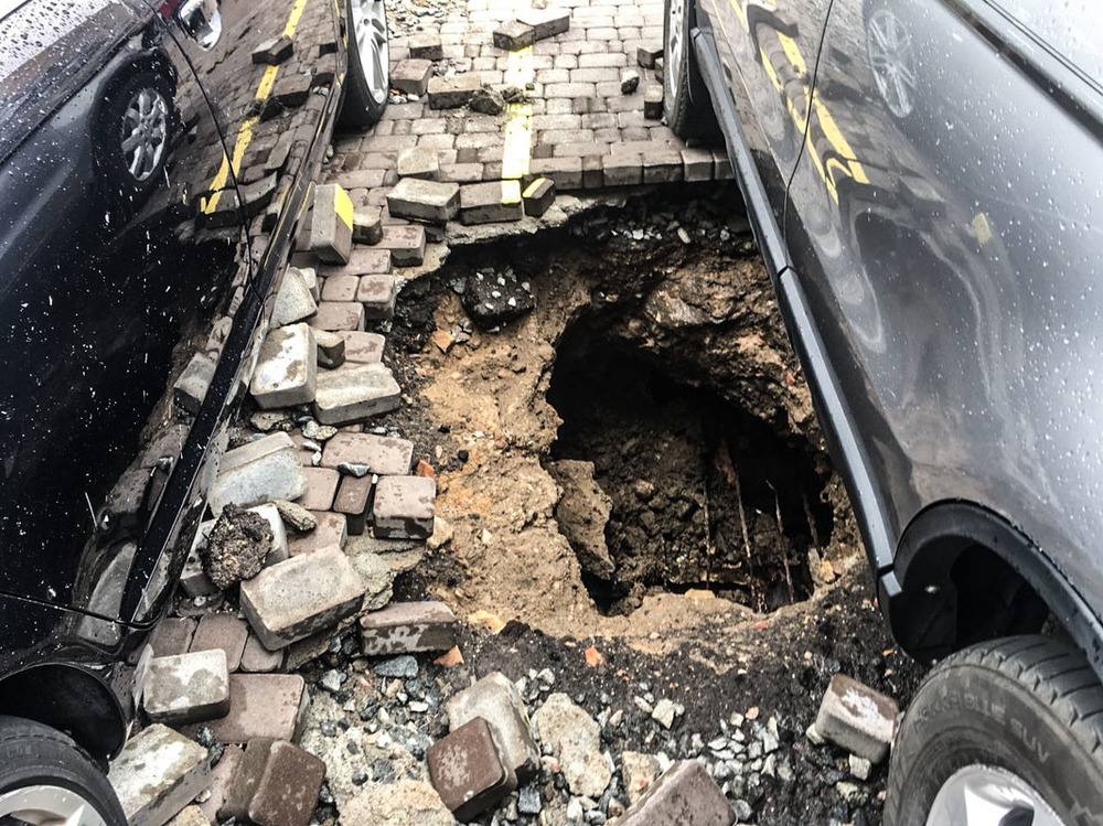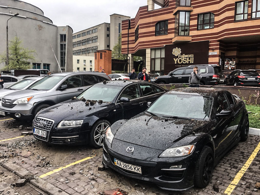 Посреди улицы начал бить пятиметровый гейзер. Из-за сильного напора куски асфальта и тротуарной плитики разлетались на припаркованные автомобили. У Honda - серьезные повреждения днища, у Audi, Mazda разбиты стекла, а части земли асфальта и плитки лежат на самих машинах.