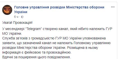 "В мессенджере Telegram создан канал, который якобы принадлежит ГУР МО Украины. Служба по связям с общественностью ГУР МО Украины уполномочена заявить, что указанный канал не принадлежит Главному управлению разведки Министерства обороны Украины. Размещенная в нем информация является фейковой и провокационной", - говорится в сообщении.