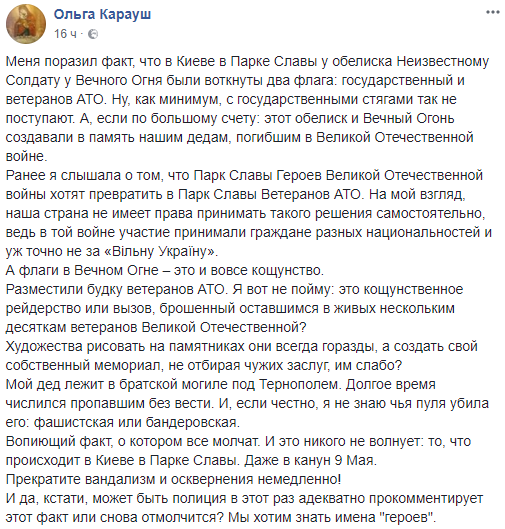 "Меня поразил факт, что в Киеве в Парке Славы у обелиска Неизвестному Солдату у Вечного Огня были воткнуты два флага: государственный и ветеранов АТО. Ну, как минимум, с государственными стягами так не поступают", - написала она и высказала пожелание, что полиция разберется в этом.