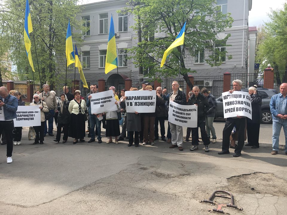 Перед началом заседания под зданием суда прошел пикет, протестанты требуют мру пресечения для Карамушки в виде ареста, а также реформирования СБУ.