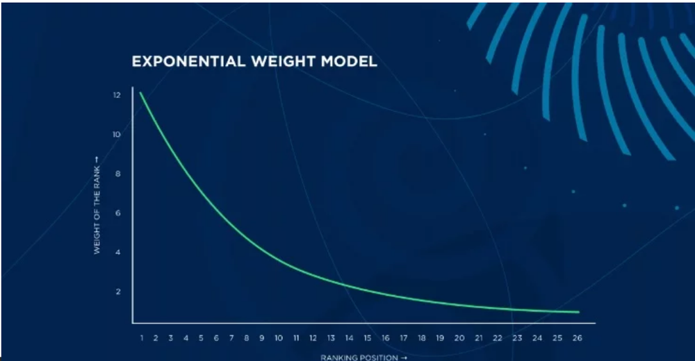 Баллы каждого из членов жюри будут иметь разный вес, в зависимости от позиции, на которую судья поставит участника. Низший балл будет влиять на итоговый результат в меньшей степени, чем высший, как показано на графике.