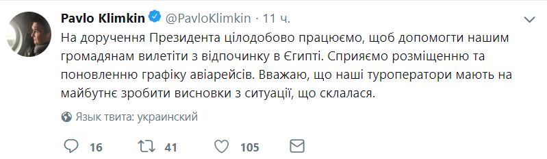 В свою очередь глава МИД Украины Павел Климкин написал в Twitter: "По поручению президента круглосуточно работаем, чтобы помочь нашим гражданам вылететь из отдыха в Египте. Способствуем размещению и обновлению графику авиарейсов. Считаю, что наши туроператоры имеют будущее сделать выводы из сложившейся ситуации".