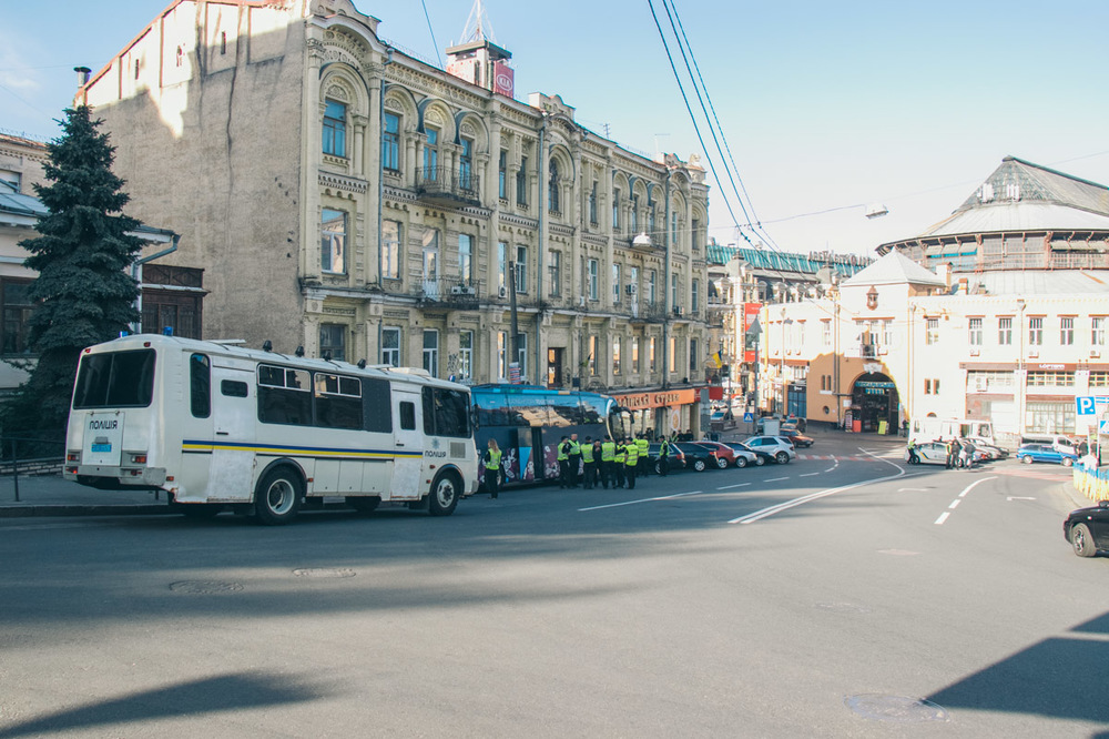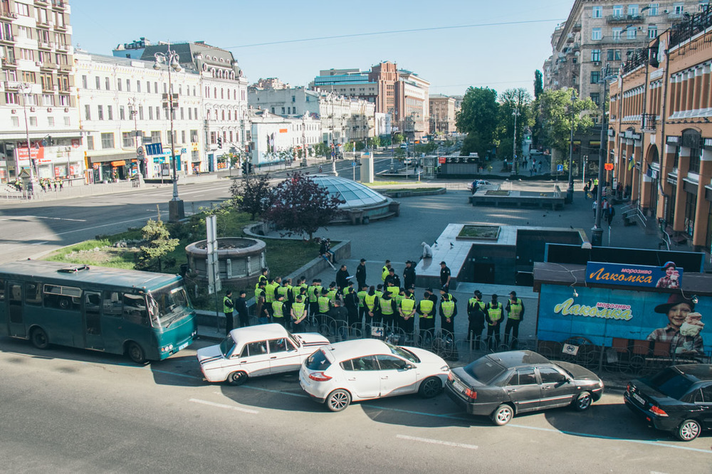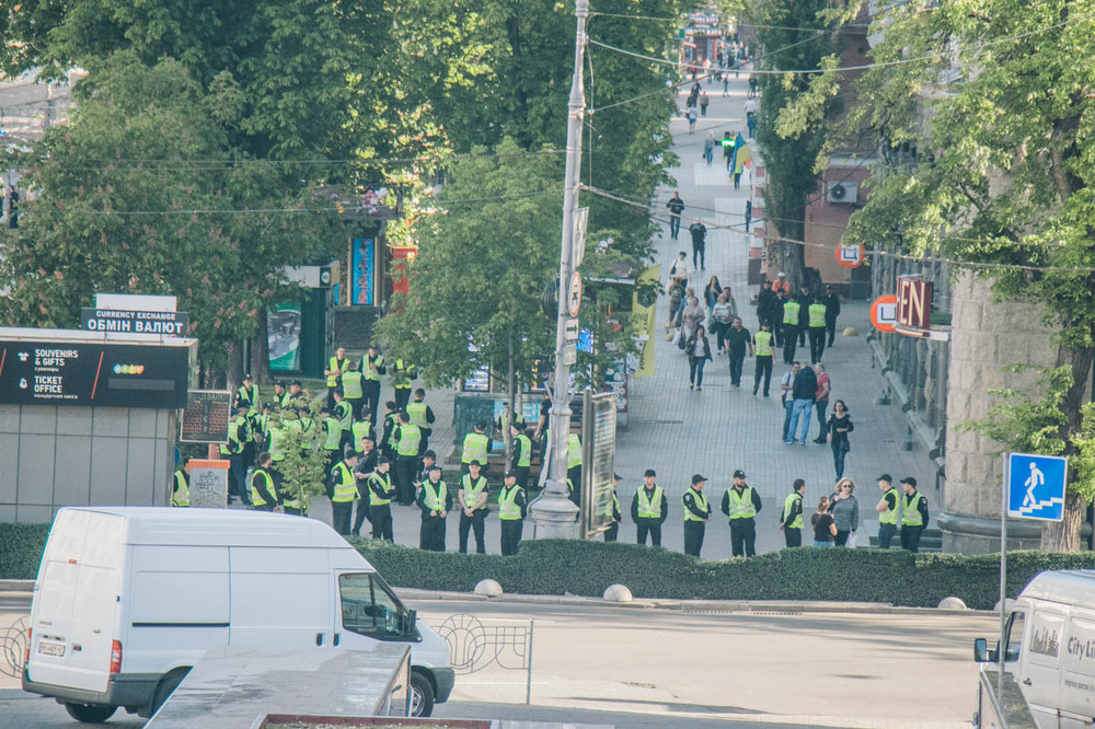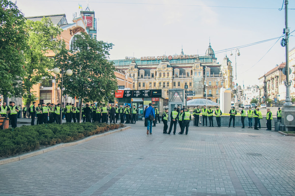А уже с 9:00 по обе стороны Крещатика от Бессарабского рынка и в сторону Майдана в 2 шеренги выстроились в полицейские. Все правоохранители одеты в салатовые жилеты, передает Информатор.