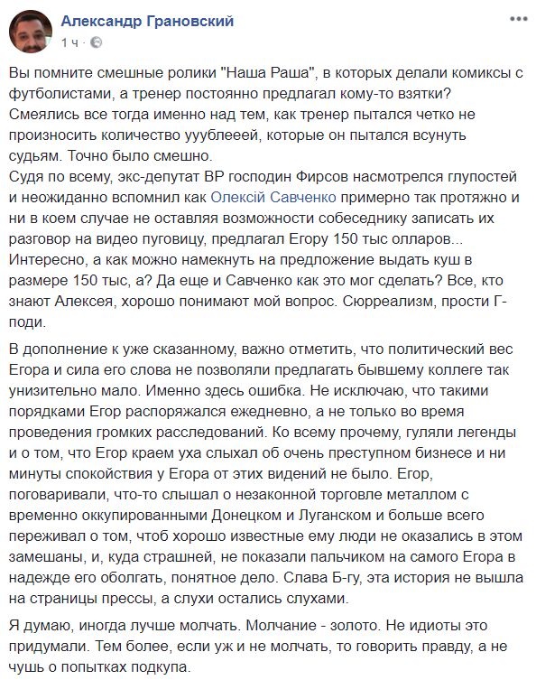 "Мне предлагали деньги за молчание, чтобы я не трогал ту или иную тему. К тебе не приходит человек и не выкладывает $150 тыс. Это все намеки. К тебе не приходит сам Грановский (депутат от БПП, которого называют доверенным лицом Петра Порошенко - ред.). Он подсылает других народных депутатов, которые  говорят: "Слушай, так нельзя", – пояснил Фирсов.