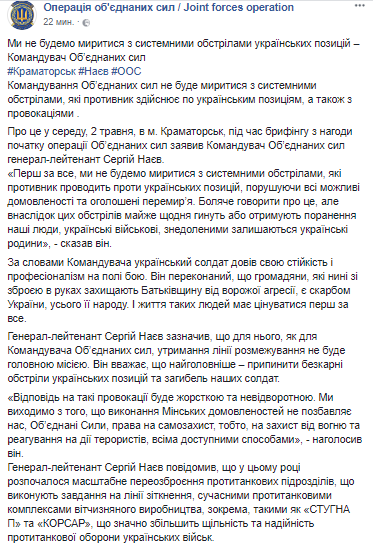 Генерал-лейтенант Сергей Наев заявил, что для него, как для Командующего Объединенных сил (которое пришло на смену АТО на Донбассе, - Прим.Ред.), удержание линии разграничения не будет главной миссией.