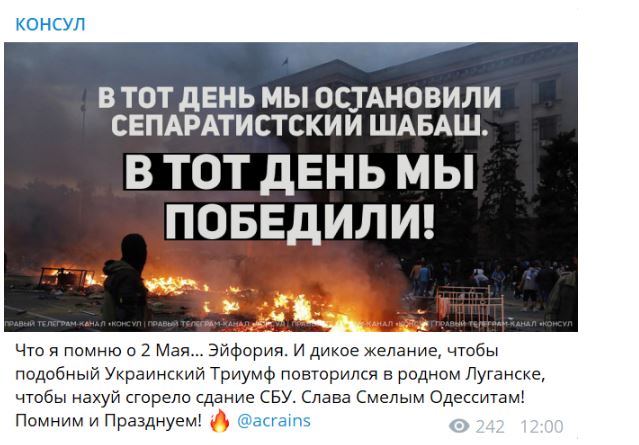 А близкий к "Нацкорпусу" телеграм-канал "Консул" заявляет, что "помнит и празднует" гибель 48 антимайдановцев.