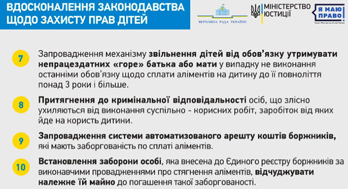 Минюст предлагает принять второй пакет законодательных инициатив, представленный в законопроекте "О внесении изменений в некоторые законодательные акты Украины относительно создания экономических предпосылок для усиления защиты права ребенка на надлежащее содержание".