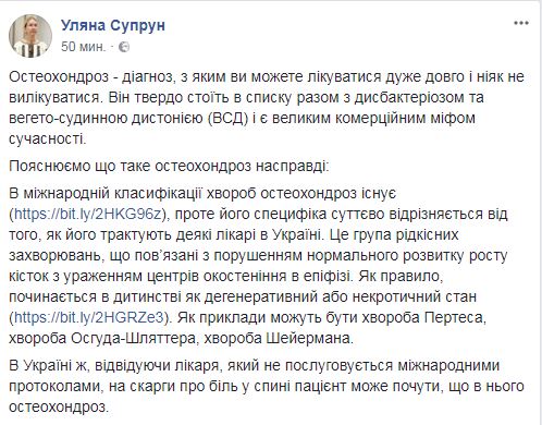 И.о.министра здравоохранения Ульяна Супрун заявила, что остеохондроз наряду с дисбактериозом и вегето-сосудистой дистонией является крупным коммерческим мифом современности.
