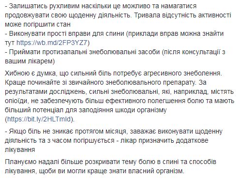 Если у вас болит спина, Супрун, исходя из западной практики, рекомендует оставаться подвижным насколько это возможно, выполнять простые упражнения для спины, принимать противовоспалительные обезболивающие средства после консультации с врачом.