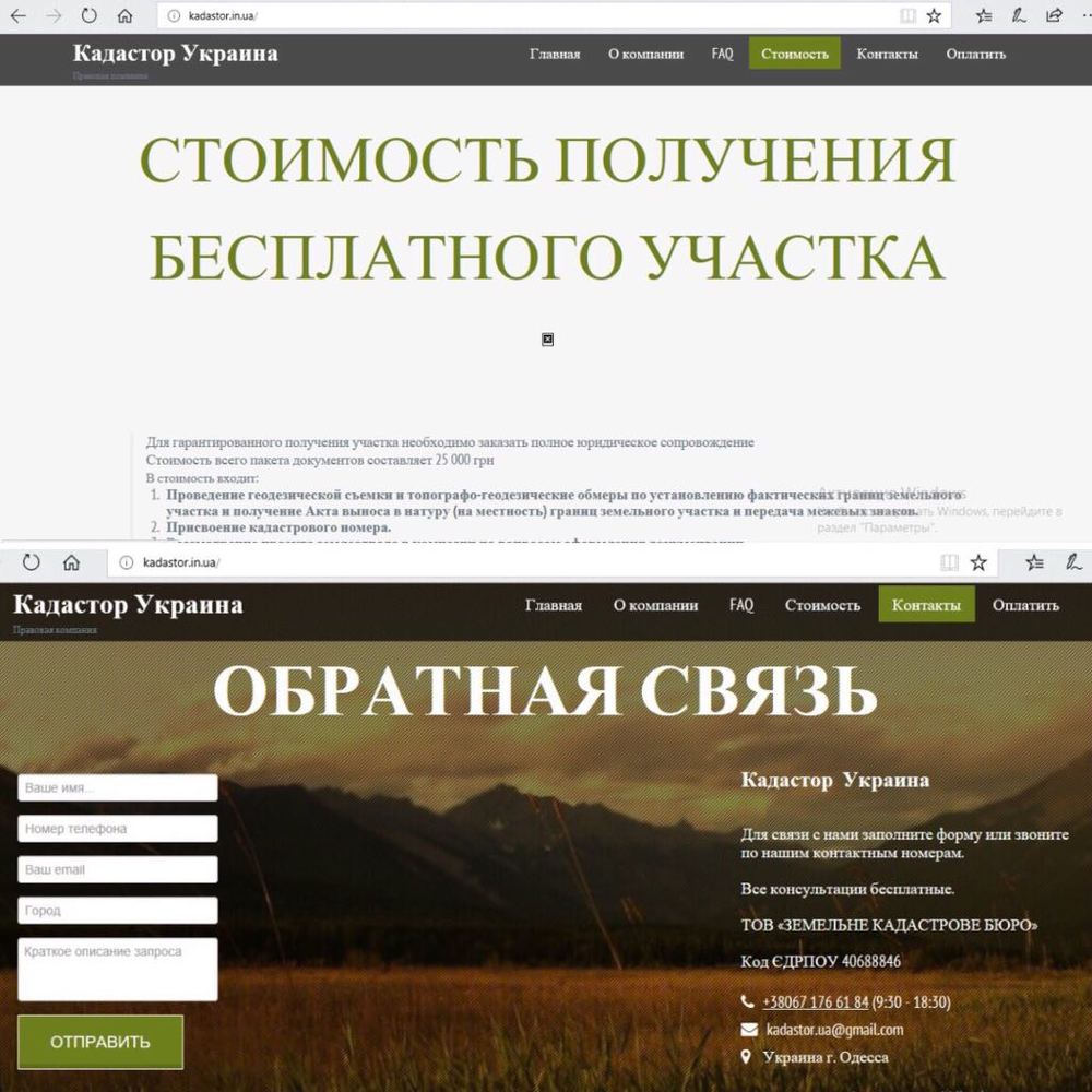 На созданном сайте мошенники указали регистрационные данные реального предприятия "Земельное кадастровое бюро", что и не вызывало сомнений у пользователей ресурса. Сайт отличался от реального оформлением и доменным именем. Обычно, с помощью этого сайта граждане пытались оплатить услуги кадастрового бюро по оформлению и получению бесплатного земельного участка на территории Одесской области. Для реализации своих преступных намерений, злоумышленники изготавливали собственноручно фиктивные договоры с использованием реквизитов предприятия "Земельное кадастровое бюро" и скрепляли их поддельной мокрой печатью.
