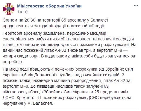 "Территория арсенала задымлена, периодически местами наблюдаются взрывы низкой интенсивности и незначительные очаги тления, которые оперативно ликвидируются пожарными расчетами. В настоящее время пожарный самолет Ан-32 выполнил три, а вертолет Ми-8 - четыре сбросы воды. В дальнейшем, авиасредства будут привлекаться по необходимости. На месте происшествия работают 4 пожарных расчета от Вооруженных Сил Украины и 6 от Государственной службы по чрезвычайным ситуациям, 3 пожарные танки, инженерная машина разграждения, самолет Ан-32 и вертолет Ми-8", - говорится в сообщении.