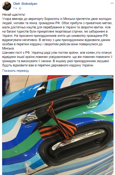"Вчера вечером в аэропорту Борисполь из Минска прилетели двое молодых людей, мужчина и женщина, граждане РФ. Оба прибыли в личных целях, имели достаточно средств для пребывания в Украине и обратные билеты. Но на багаже ​​туристов были прикреплены георгиевские ленты, которые запрещены в Украине. По просьбе пограничников снять эту символику граждане РФ отреагировали негативно. В связи с этим пограничники отказали данным лицам в пересечении границы и обратным рейсом они вернулись в Минск", - написал Слободян.