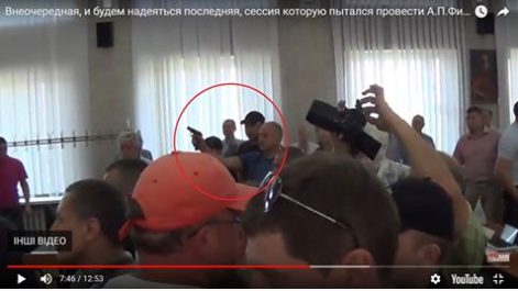 Затем активисты поднялись на трибуну и, по словам очевидцев, надели депутату Александру Рыбакову на голову пакет с кефиром, а мэра Андрея Фисака облили зеленкой. После этого раздались два выстрела. По словам очевидцев, один - в потолок, второй - в сторону активистов. Стрелял из пистолета депутат Рыбаков.