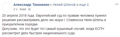 "20 апреля 2018 Европейский суд по правам человека принял решение рассматривать дело экс-мэра города Славянска Нели Штепы в приоритетном порядке", - написал он.