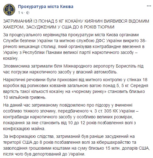 В Борисполе за контрабанду кокаина задержали осужденного в США хакера