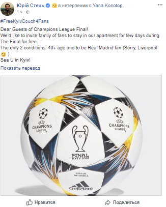 "#FreeKyivCouch4Fans Дорогие гости финала Лиги чемпионов! Мы хотели бы пригласить семью фанатов футбола, которые могли бы остаться в нашей квартире в течение нескольких дней во время финала Лиги чемпионов бесплатно. Только 2 условия: возраст 40+ и быть поклонником Реала (извините, Ливерпуль). Смотрите финал Лиги чемпионов в Киеве", - написал Стець.