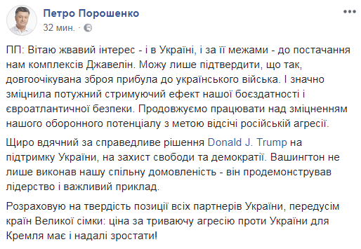 Петр Порошенко, подтверждая появление "Джавелинов", заявил, что они нужны для противодействия России.
