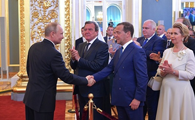 Владимир Путин не стал жать руки всем, кто находится в зале, но специально спустился со сцены к первому ряду, где стояли бывший канцлер Германии Герхард Шредер, патриарх Кирилл и премьер-министр Дмитрий Медведев с женой. Путин пожал руку Медведеву, кивнул его супруге. Спустя пару часов стало известно, что Путин предложит Госдуме вновь назначить Медведева премьером (формально правительство ушло в отставку сразу после инаугурации).