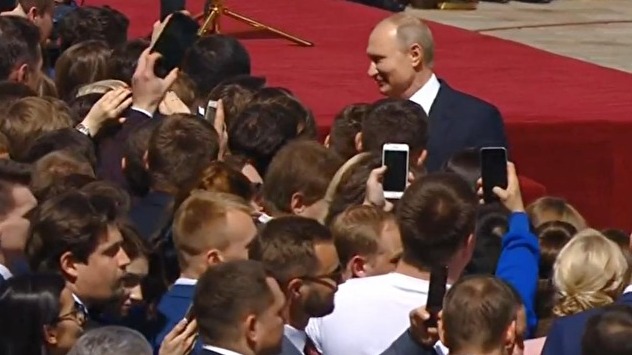 Непривычная картинка: люди в Большом Кремлевском дворце не застыли с торжественно-испуганными выражениями лиц, а активно снимают происходящее на телефоны. Кто-то даже пытается делать селфи в то время, как Владимир Путин идет по красной дорожке. Некоторым из наблюдателей это показалось раздражающим ("А как же сакральность власти?"), а кому-то понравилось (гостей не стали мучить ограничениями, проявив либерализм). В целом, на наш взгляд, получилась интересная картинка, сочетание традиции и модерна.