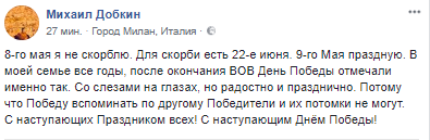 "Не скорблю! Завтра буду праздновать День Победы", - пишет Инна Иваночко, общественный деятель из Львова.