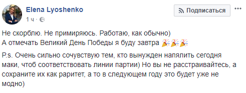 "Не скорблю. Не примиряюсь. Работаю, как обычно. А отмечать Великий День Победы я буду завтра", - поддержала она флешмоб противников Дня примирения.