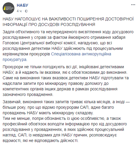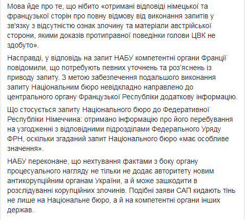 "САП, по неизвестным для НАБУ причинам, распространяет сведения, не соответствующие действительности. Речь идет о том, что якобы "получены ответы немецкой и французской сторон о полном отказе от выполнения запросов в связи с отсутствием признаков преступления и материалы австрийской стороны, которыми доказательства противоправного поведения председателя ЦИК не добыты", - говорится в сообщении.