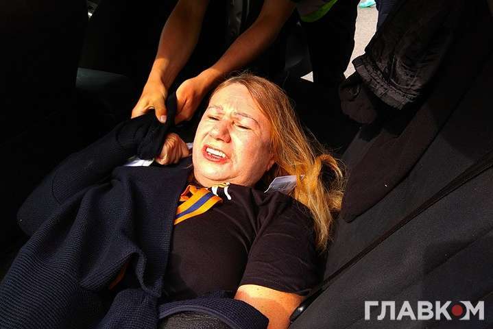 За ношение георгиевской ленты была задержана глава Института правовой политики и социальной защиты имени Ирины Бережной Елена Бережная. К ней применили физическое наличие как неизвестные активисты С14, так и работники полиции. Ее забрали в печерский райотдел.