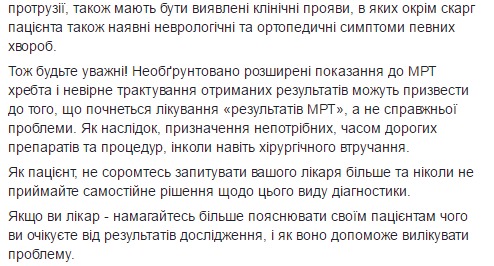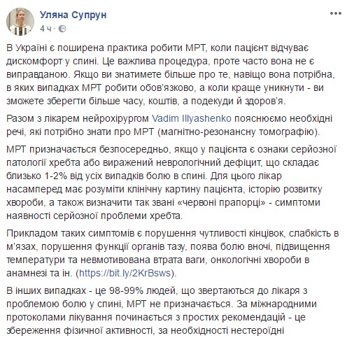 "В Украине есть практика назначать МРТ, когда пациент испытывает дискомфорт в спине. Это важная процедура, однако часто она не оправдана. Если вы будете знать больше о том, зачем она нужна, в каких случаях МРТ делать обязательно, а когда лучше избежать - вы сможете сохранить больше времени, средств, а иногда и здоровья", - пишет Супрун.