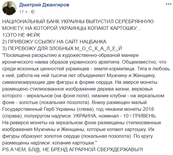 "Блин, вчера Украина порннау, сегодня золотая картошка. Кстати, что это за жёлтый монстр на монете хавает наше единственное достояние?", - пишет юрист Дмитрий Назарец.