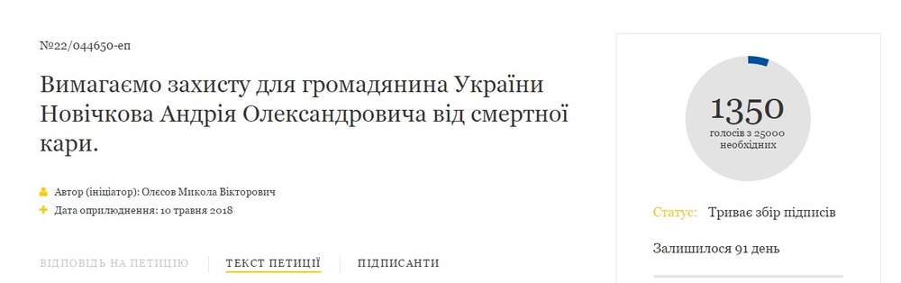 "Требуем защиты гражданина Украины Новичкова Андрея Александровича от смертной казни", - говорится в петиции.