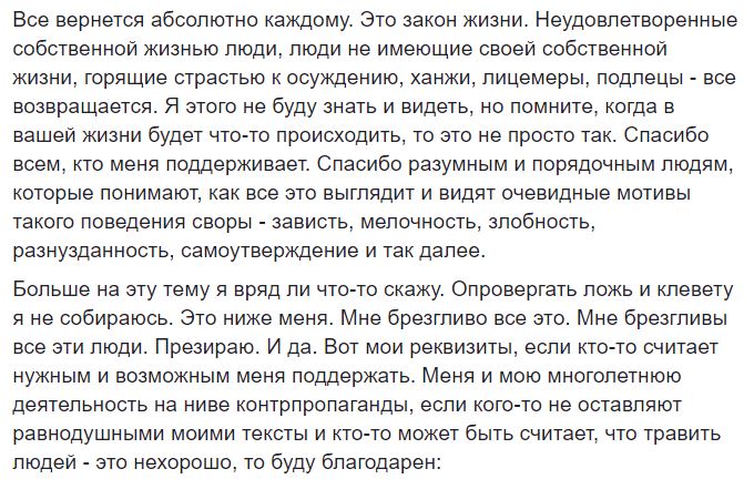 "Опровергать ложь и клевету я не собираюсь. Это ниже меня. Мне брезгливо все это. Мне брезгливы все эти люди. Презираю. И да. Вот мои реквизиты, если кто-то считает нужным и возможным меня поддержать. Меня и мою многолетнюю деятельность на ниве контрпропаганды, если кого-то не оставляют равнодушными моими тексты и кто-то может быть считает, что травить людей – это нехорошо, то буду благодарен: