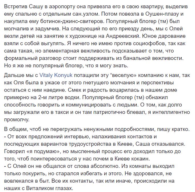 С утверждением "бабы-дуры" я не буду спорить, но чисто по-человечески лично я была в большом шоке увидев одну из жертв его "любви и идейной близости", хотя удивить меня сложно. Это отощавшая сутулая девочка с потухшим взглядом, безустанно повторявшая: "Ну как же, он ведь говорил... он не мог, он еще образумится". Эта девочка перечисляла ему ежемесячно 5000 из своей крошечной зарплаты в 6000. Эту девочку, когда она обратилась к Оле узнать, все ли ок с Сашей, он называл сумасшедшей преследовательницей", – пишет журналистка.