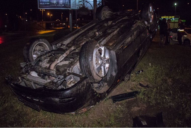 Ночью на проспекте Героев Сталинграда в Киеве Toyota вылетела на зеленую зону у дороги и перевернулась.