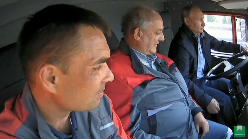 14.59 Колонна "Камазов" уже достигла острова Тузла. Тем временем в ведущей машине Путин обсуждает строительство моста с руководителем строительства объекта. Всего в колонне едет 36 автомобилей.