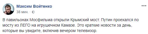 16.07 Журналист Максим Войтенко иронизирует: "В павильонах Мосфильма открыли Крымский мост. Путин проехался по мосту из ЛЕГО на игрушечном Камазе. Это краткие новости за день, которые вы увидите, включив вечером телевизор".