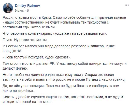 16.38 Еще два похожих мнения о реакции украинцев на открытие Крымского моста. Политтехнолог Дмитрий Раимов пишет: "Россия открыла мост в Крым. Само по себе событие для крымчан важное - наши соотечественники не будут испытывать тех трудностей с поставками еды, которые были.