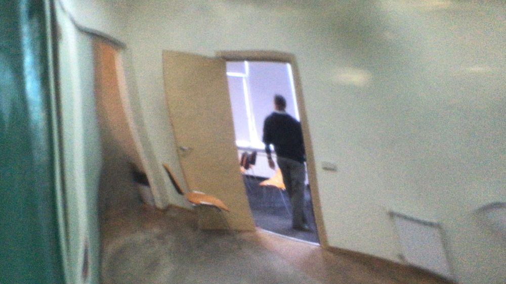 Охранник, точнее, сторож в камуфляже, рассказал, что камер видеонаблюдения в редакции нет. Уборщица добавила, что в начале восьмого обысков ещё не было.