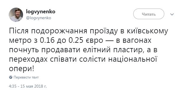 "После подорожания проезда в киевском метро с 0.16 до 0.25 евро - в вагонах начнут продавать элитный пластырь, а в переходах станут петь солисты национальной оперы!", - иронизирует logvynenko.