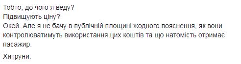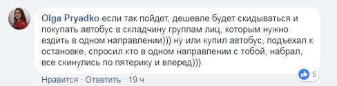 Ольга Прядко добавила: "Если так пойдет, дешевле будет скидываться и покупать автобус в складчину группам лиц, которым нужно ездить в одном направлении))) Ну или купил автобус, подъехал к остановке, спросил кто в одном направлении с тобой, набрал, все скинулись по пятерику и вперед)))."