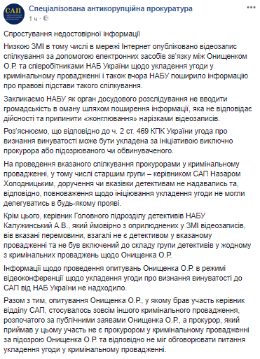 "Учитывается, что в опубликованных видеозаписях переговоров, вероятно, руководителя Главного подразделения детективов НАБУ и других детективов с подозреваемым Онищенко, идет речь о конкретных условиях заключения сделки, а именно обсуждение четкой суммы и дальнейшей судьбы предприятий, принадлежащих ему и фактического подтверждения факта "конфиденциального" общения без ведома прокуроров - процессуальных руководителей, 14 мая сведения об указанных событиях внесены в ЕРДР и начато уголовное производство", - говорится в сообщении.