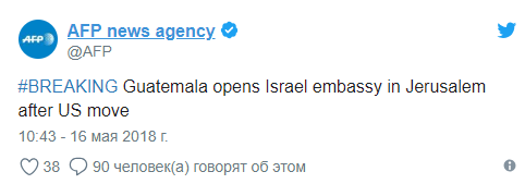 "Гватемала открыла посольство в Иерусалиме после США", - говорится в сообщении.