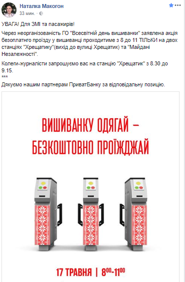 Завтра, 17 мая, во Всемирный день вышиванки в киевском метро заявлена акция бесплатного проезда, которая будет проходить с 8 до 11 только на двух станциях "Крещатике" (выход к улице Крещатик) и "Майдане Незалежности".