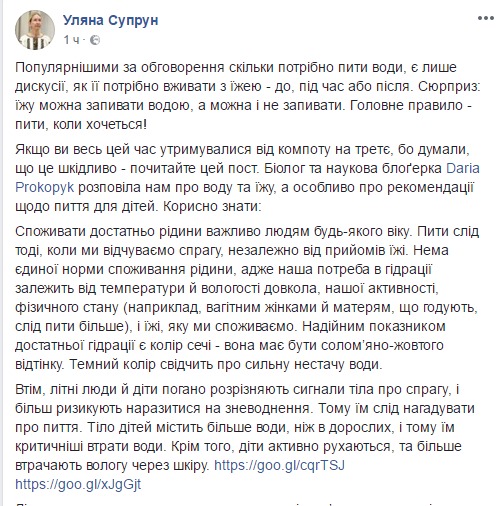 "Полезно знать: потреблять достаточно жидкости важно людям любого возраста. Пить следует тогда, когда мы испытываем жажду, независимо от приемов пищи. Нет единого нормы потребления жидкости, ведь наша потребность в гидрации зависит от температуры и влажности вокруг, нашей активности, физического состояния (например, беременным женщинами и кормящим матерям, следует пить больше), и пищи, которую мы потребляем. Надежным показателем достаточной гидрации является цвет мочи - она ​​должна быть соломенно-желтого оттенка. Темный цвет свидетельствует о сильной нехватке воды. Впрочем, пожилые люди и дети плохо различают сигналы тела о жажде, и более рискуют подвергнуться обезвоживанию. Поэтому им следует напоминать о питье", - написала Супрун.