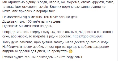 "Дети активно двигаются, и больше теряют влагу через кожу. Дети, которые пили достаточно, в тестах на внимание и память имели лучшие результаты. Недостаточная гидрация приводит к запорам, плохому пищеварению, агрессии и просто, казалось бы, беспричинным капризам. Детям советуют потреблять воду в течение всего дня, и особенно во время активных игр или занятий спортом,"- написала она.
