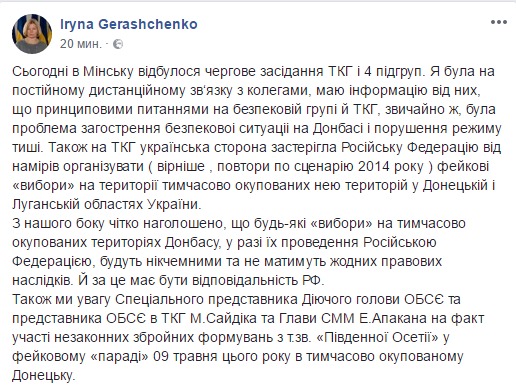 О результатах заседания, в том числе обмене пленными, рассказала первый вице-спикер Верховной рады Ирина Геращенко.