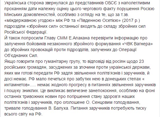 "Если говорить про гуманитарной группу, то ответа от россиян по 23 российским гражданам, осужденным за преступления против украинского государства, которых мы готовы передать РФ для освобождения политзаключенных и заложников, до сих пор нет. Нет прогресса в вопросах освобождения заложников и поиска пропавших. Это вызывает огромное беспокойство, особенно на фоне последних тревожных новостей об ухудшении состояния здоровья наших политзаключенных и заложников, объявленной Сенцовым голодовке, длительном голодании Балуха. Вопрос заложников требуют давления всего мира на РФ", - заявила она.